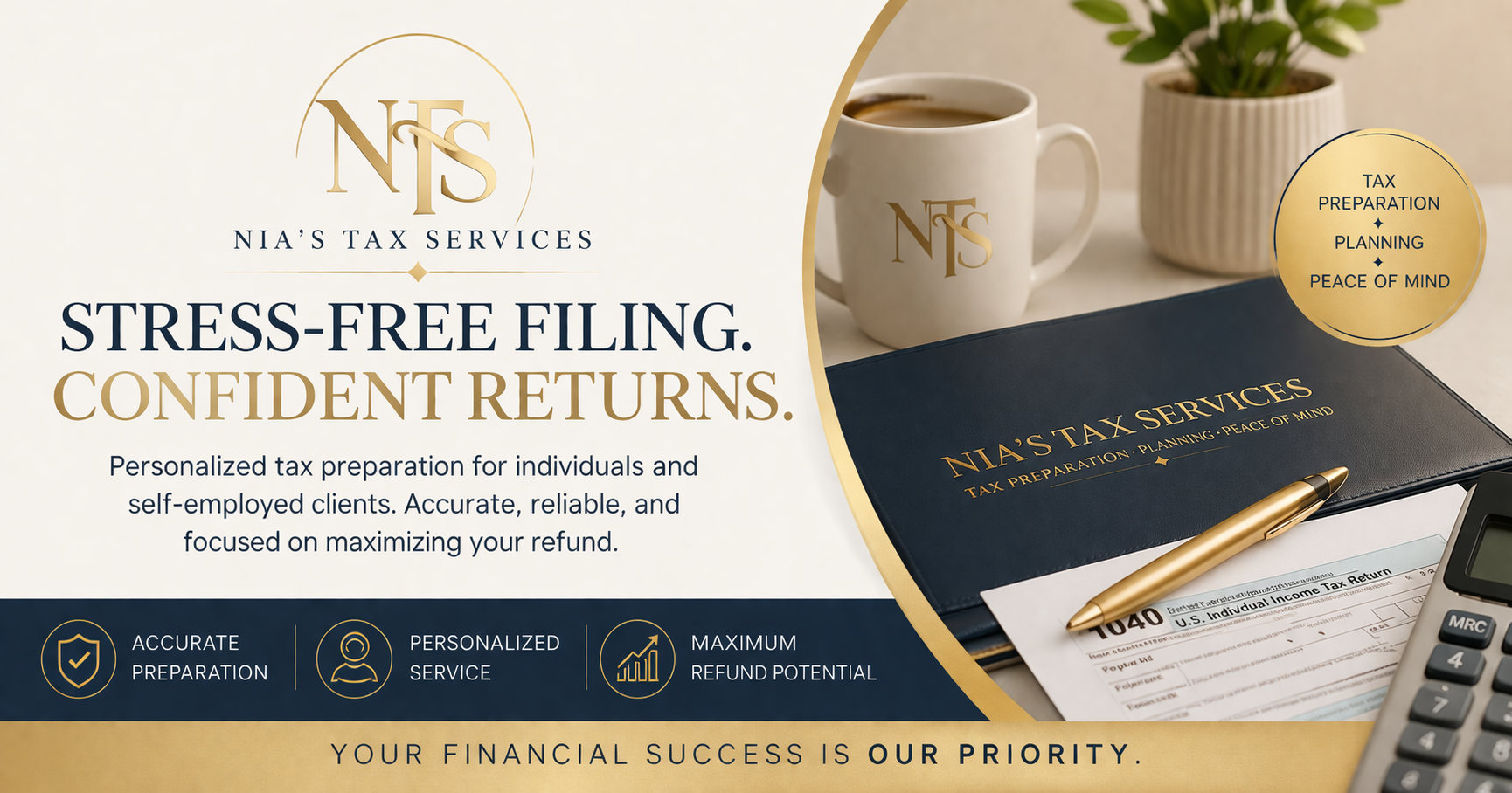 At Nia’s Tax Services LLC, we provide accurate, secure, and personalized tax preparation designed to give you clarity and confidence. Every return is prepared with professional care so you understand your numbers — not just sign them.